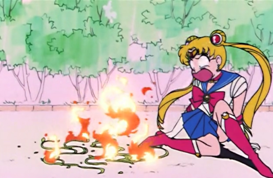 Once the team’s fire-slinger shows up, taking out a plant monster is a snap. The Tux even gets there in time to pose in a tree and do his thing before leaving again. Then everyone un-transforms and Mamoru comes running up to them all like “Boy that was crazy right I was totally over there this whole time and who’s Tuxedo Mask HAHA NEVER HEARD OF HIM.”