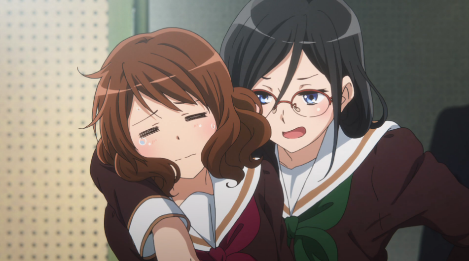Because of when and how the story ends, it actually reads more like the two girls are in the beginnings of a legit romantic relationship than like typical KyoAni queerbaiting. Yeah, one of them admits to having a crush on the teacher at one point, but the next few episodes are so rife with sexual tension and flirting between her and the other girl that her “confession” doesn’t feel like a sunk ‘ship so much as just an indication that she might be bi/pan or have varying levels of feelings for multiple people (which, you know, is a thing that happens).