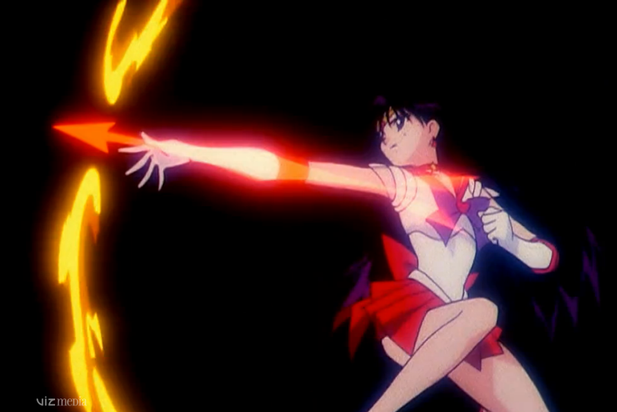 When Rei hears this, she… Well, you know how Ami went on a metaphysical dream quest to find her inner warrior and unlock her hidden potential? Yeah, no, that shit takes WAY too much time. Instead, let’s just get SO ANGRY that we produce a badass fire bow WITH OUR MINDS. Rei gives a speech about how girls’ dreams are unlimited and how important it is to be yourself and walk your own path, and burns this mother down.