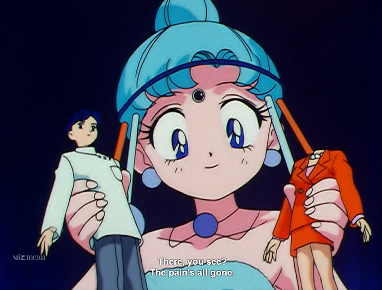 And then sometimes, wedged in there, you get an episode about Usagi and Chibiusa going to the dentist. But, hey, nobody bats .1000. And at least there was a hefty amount of silliness and fun scenes (such as the one in the screenshot above) to pad both episodes in enjoyable interactions.