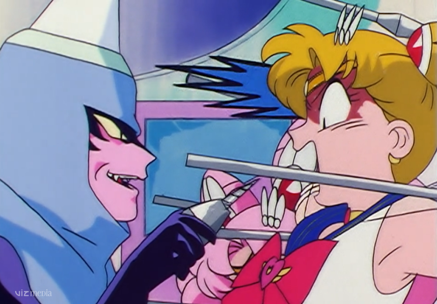 So, yeah: Palla tries to snag both Bunnies’s Dream Mirrors, but Tuxedo Mask interrupts her before she has the chance. The two “spar” while Palla’s Evil Dentist Lemures pins the now-transformed Moons to a wall and tries to drill the cavities straight out of their skulls.