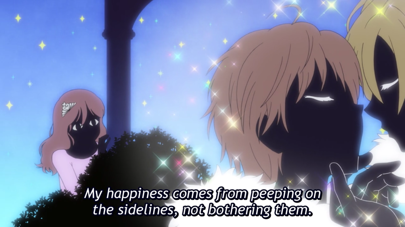 - Kiss Him, Not Me: I know the manga series is well-liked by a lot of people, but there was a shallow and voyeuristic undercurrent to this first episode (the protag’s objectification and fetishization of gay men coupled with the way the guys only become interested in her once she’s skinny and “hot”) that struck me as viscerally unpleasant and mean-spirited. The last 10 minutes or so were a bit better, but the premise just didn’t sit well with me, so I’m out.